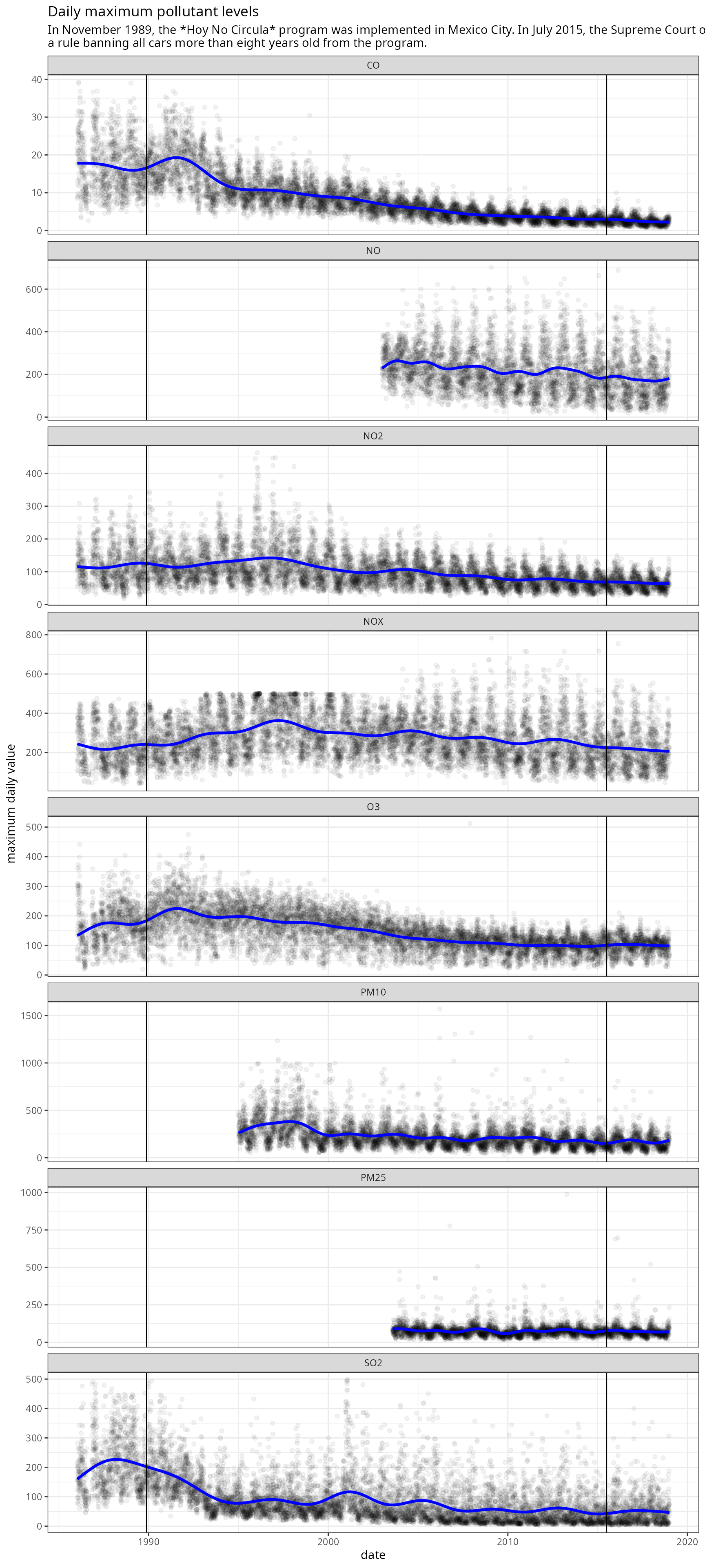 We can plot all pollutants going back to 1986 and add a trend line based on a GAM controlling for the month of the year. The plot includes vertical lines representing the start of Hoy No Circula and the Supreme Court decision that the program does not necessarily apply to older cars. A more complex model is left as an exercise for the reader.