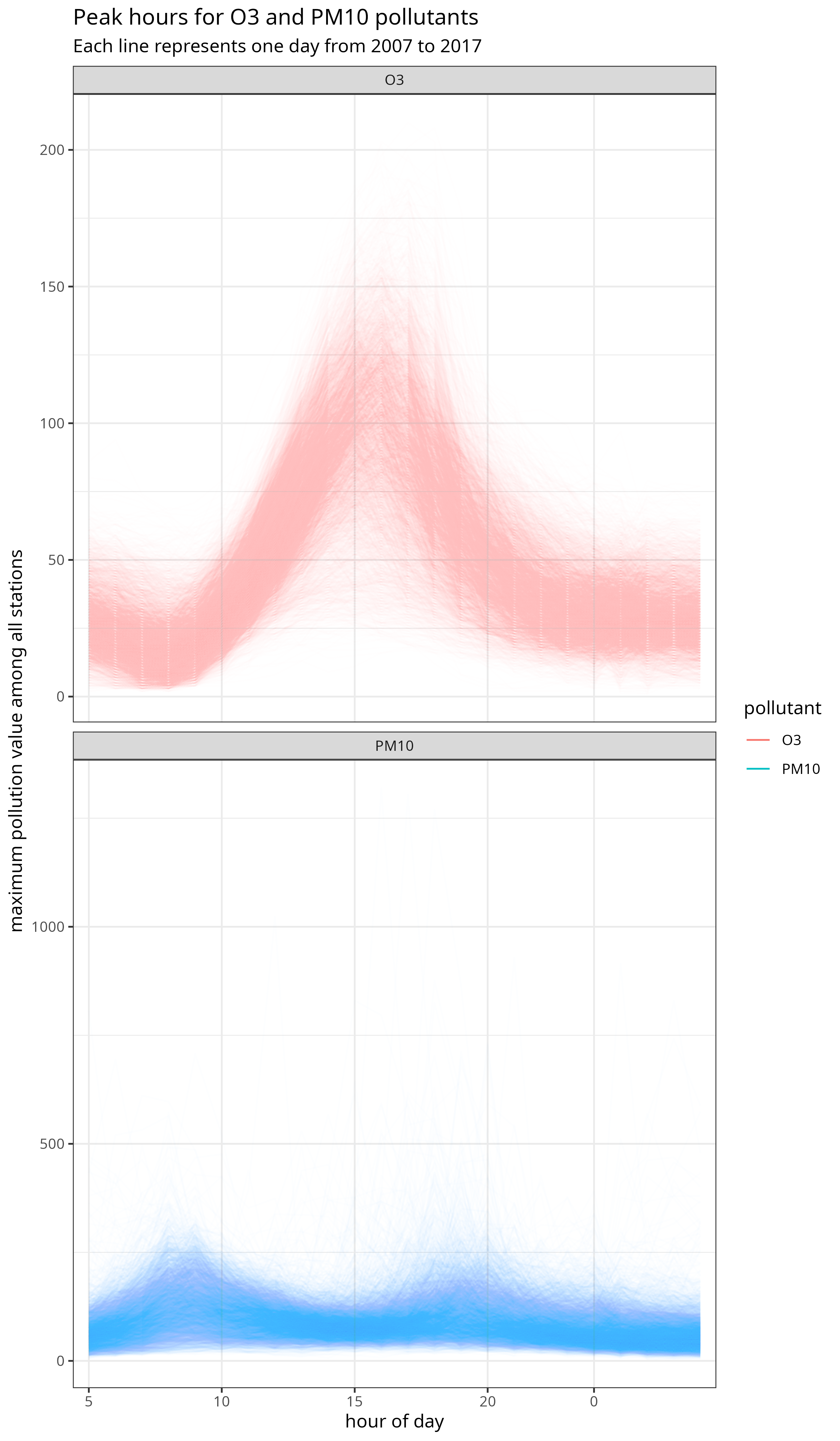 labs(title = "Peak hours for O3 and PM10 pollutants",