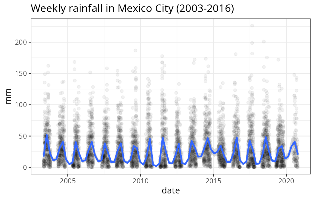 ggtitle("Weekly rainfall in Mexico City (2003-2016)") +
