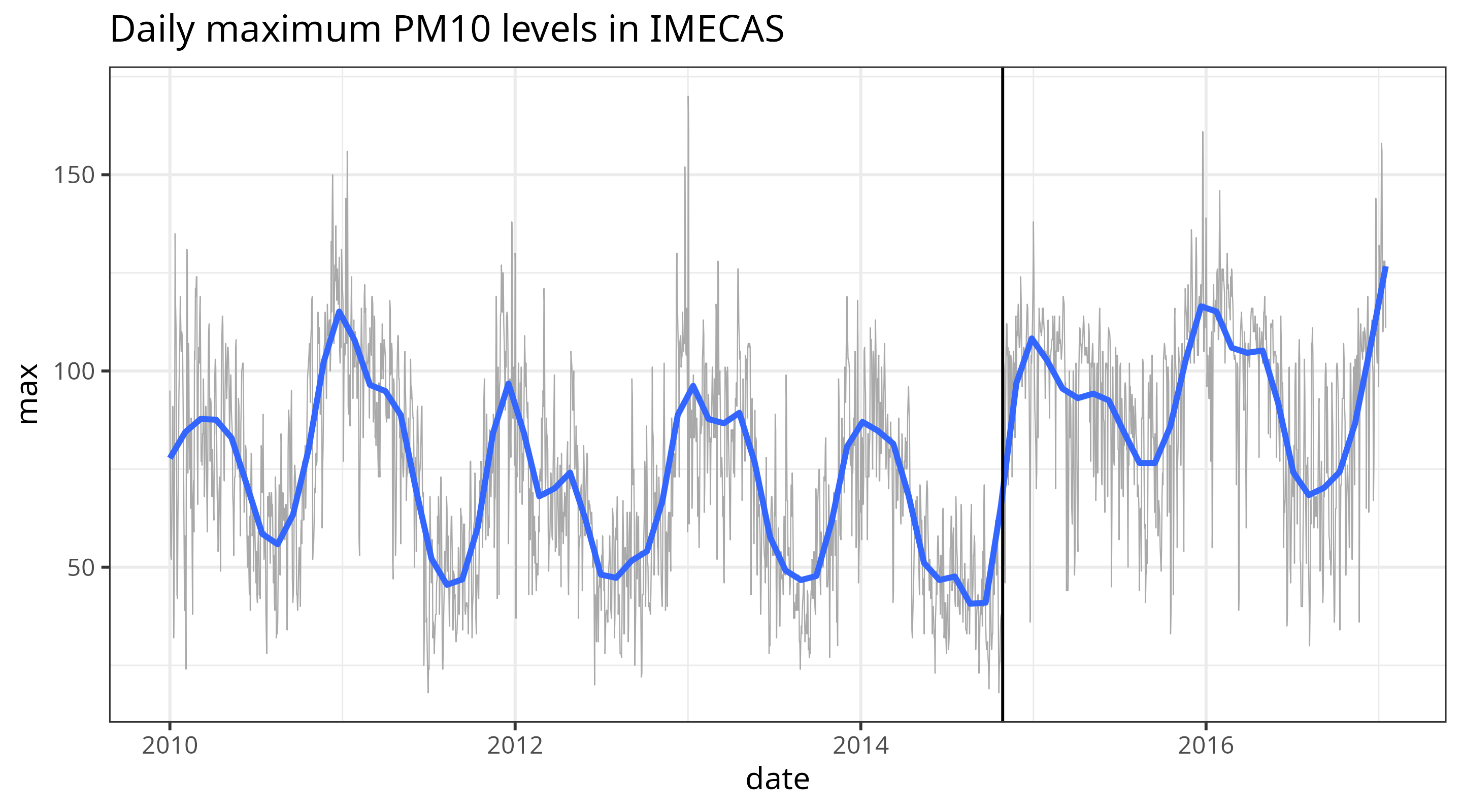 ggtitle("Daily maximum PM10 levels in IMECAS") +
